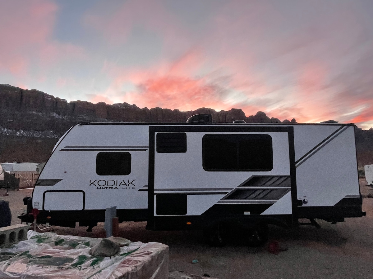 New! RV adventure rental set up for a tiny home experience! Approximately 7 miles to Moab! Now with 100% STARLINK satellite powered wifi! This Kodiak RV is 28 foot is loaded with upgrades! Fully self contained Adventure Basecamp! Everything is provided! Double over double bunks, upgraded walk around Queen bed, led lighting, just a few mikes outside MOAB! This is a beautiful new RV, priced to help you enjoy all Moab has to offer without putting a strain on the budget!