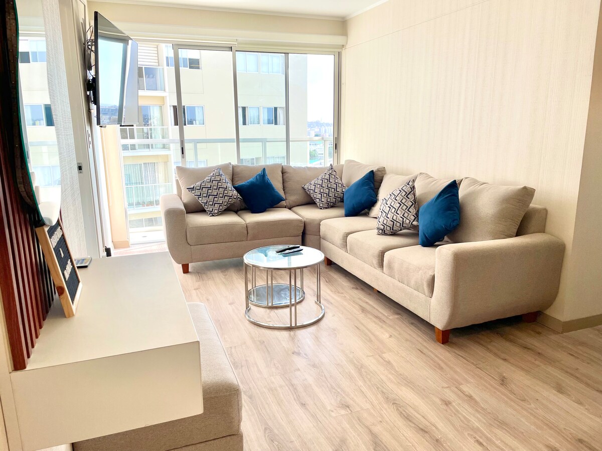 Este alojamiento es un departamento de estreno con amplia e impresionante vista al mar, al morro solar y al malecón de barranco. El departamento tiene un diseño muy acogedor y lujoso que ha sido diseñado para que los huéspedes pasen unos días de relajo con las mejores comodidades. Con acceso a distintas áreas del edificio como el gimnasio, la piscina y la terraza en el último piso.
