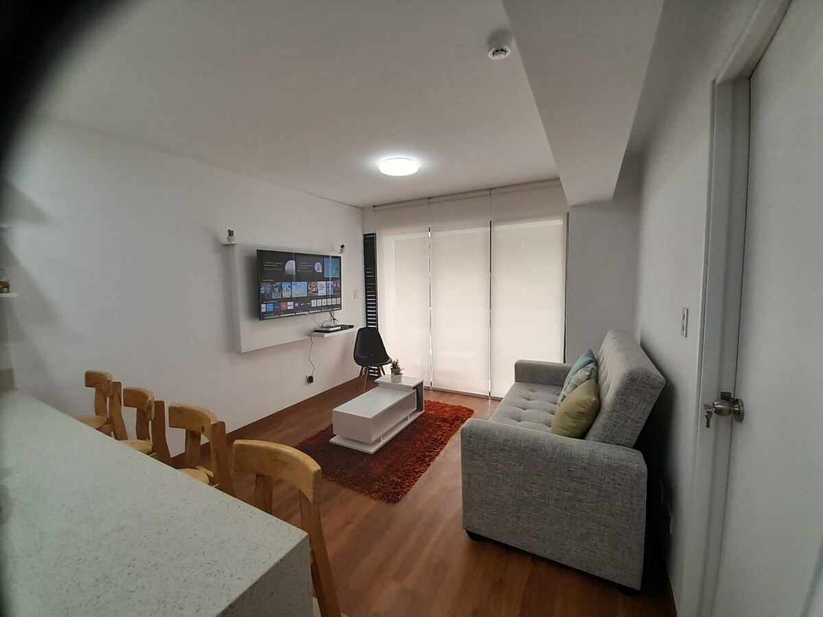 Enjoy a quiet and comfortable stay in this brand new mini apartment in a quiet, central area of Surco. It is located near Benavides main avenues, access to public transportation, a mini-market and pharmacies within 100 meters The apartment has everything you need to feel at home: TV, internet, dishes, newly equipped kitchen and comfortable furniture.