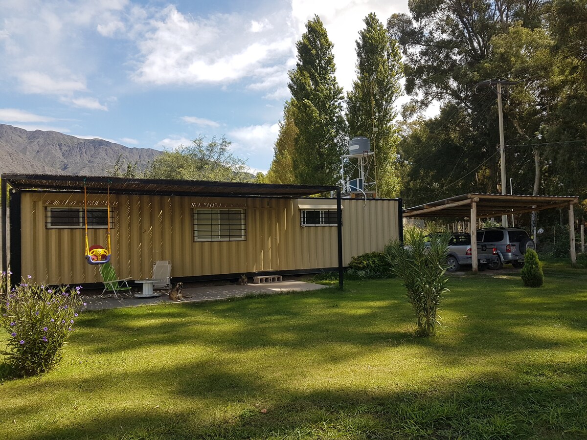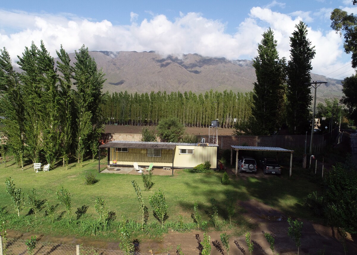 Container house for 2 people. With integrated kitchen with everything you need to cook. We have large green spaces, chulengo type grill and covered parking. Circulating are our pets: 2 cats, 2 dogs and 2 chickens, friendly and respectful. Coffee, tea and mate are included to prepare. You can also request breakfast service (optional). Exceptional view of the mountains and tranquility since the house is located in a semi-rural area, surrounded by mountains and vineyards.