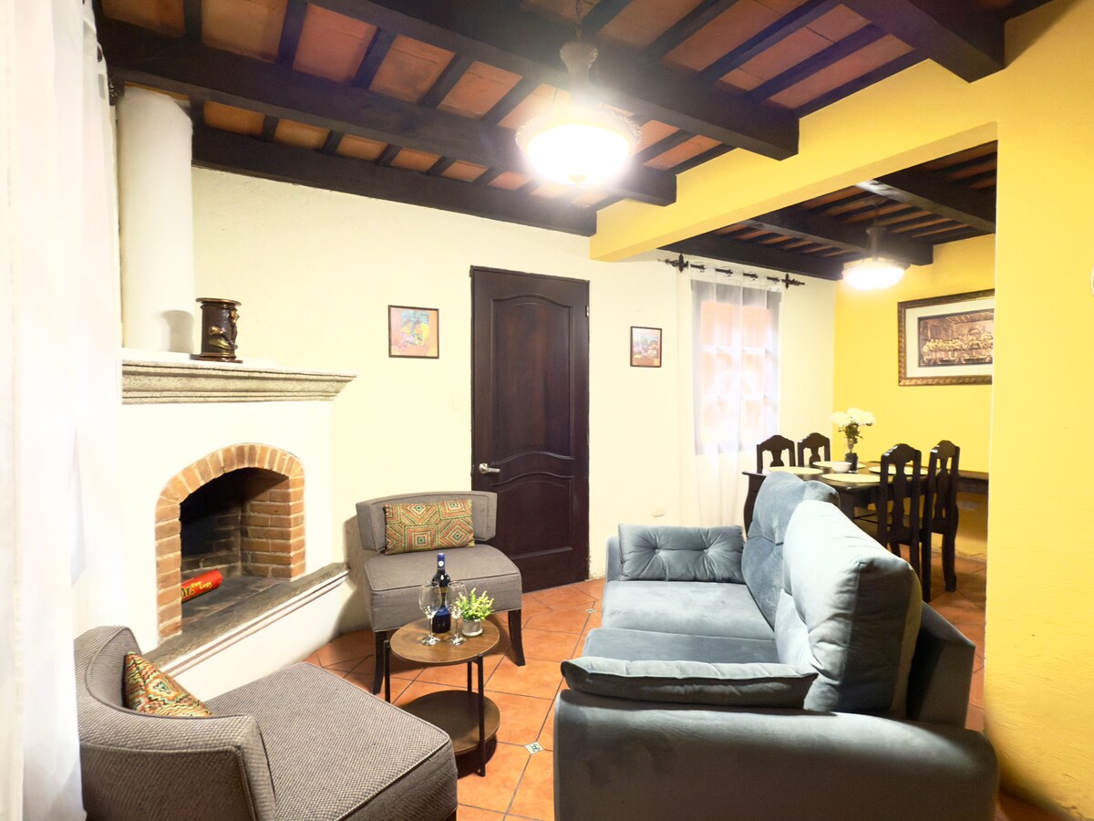 Apartamento bien equipado. Es un lugar para descansar en pareja, con familia o viaje de trabajo. En el primer nivel sala con chimenea, comedor para 4 personas, cocina bien equipada con todos los implementos incluso para hornear. Segundo nivel la habitación con chimenea, un escritorio para trabajar, 2 camas matrimoniales, baño con tina y ducha. Internet de alta velocidad, excelente café guatemalteco para su estadía y todos los implementos para cocinar.