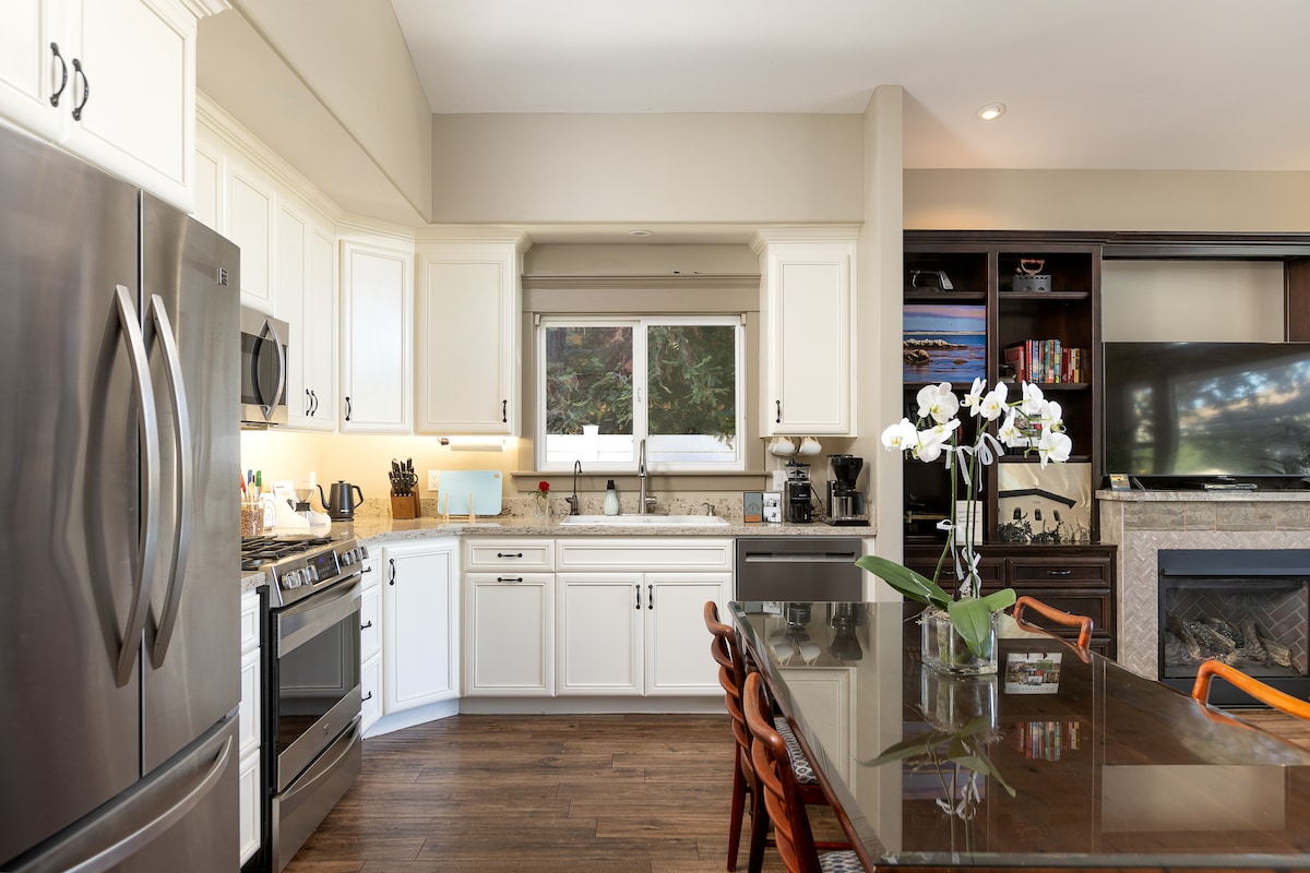 This elegant private, fully-furnished apartment has 2 bedrooms/2 baths, full kitchen, large living/dining room, washer/dryer, office, high-sped internet/WiFi , TV w/ Roku, private deck, fireplace, and surrounded by mature Live Oaks. A five-minute walk to the Beach with beach essentials for your use. Great restaurants, wine/beer bars + shopping. The area is well-known for its ocean + hiking adventures, rated by Sunset Magazine as the third best beach in California. Parking for two cars on-site.