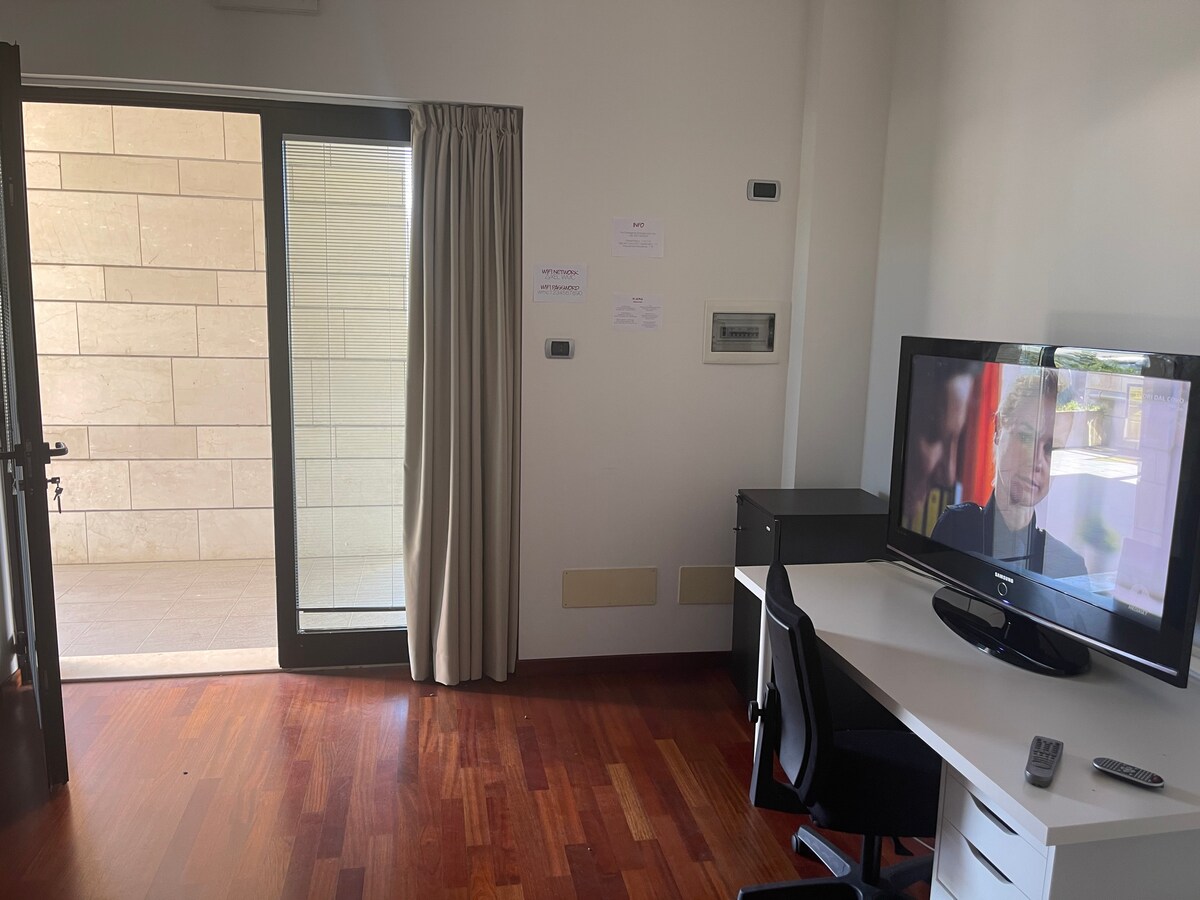 Appartamento open space situato sul territorio Sammarinese. Perfetto per brevi soggiorni lavorativi. Al letto matrimoniale e' possibile aggiungere un terzo posto aprendo il divano letto. Sono presenti anche una scrivania, un tavolo da pranzo, un frigobar e una piastra elettrica con la quale consumare un semplice pasto. All’arrivo gli ospiti troveranno una bottiglia di vino nostrano di benvenuto e una macchina da caffè con cialde per rendere il soggiorno ancora più piacevo