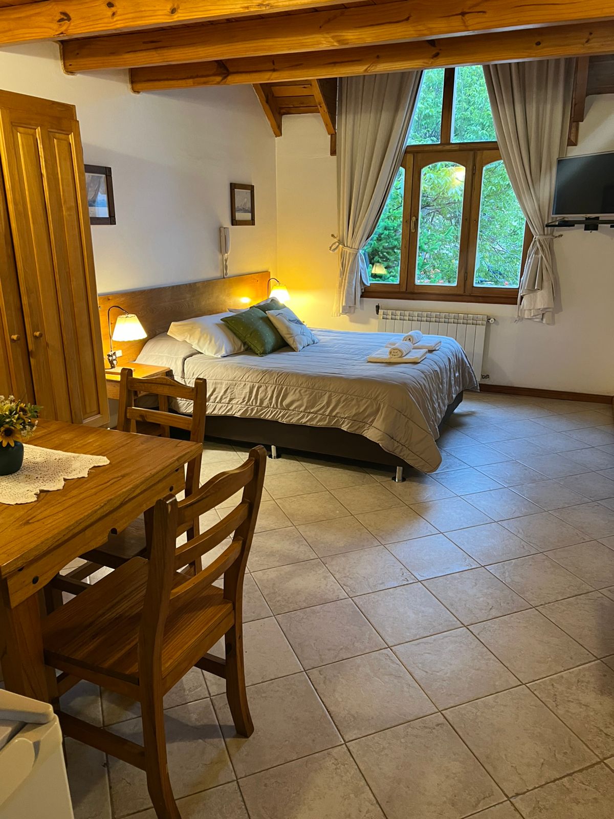 Single room apartment for 2 people 1st floor per staircase c/heated pool located in the SUM of the building, you will be in the Ctro de SM de los Andes, 2 cdras from Lake Lacar, 1 from Av. San Martín, close to restaurant area and tourist departures. Extra king bed, Kitchen, Private Bath, Linens, Towels and Towels Included, Tableware, Anafe, Microwave, Coffee Maker, Toaster, Fridge. Full bathroom w/bathtub,TV, Placard, WiFi, Heating, Fte box, private garage on site.