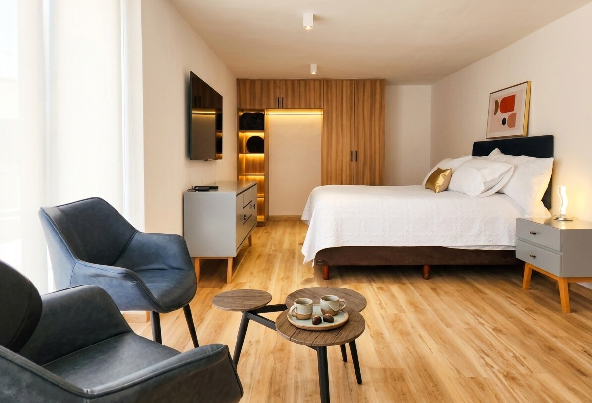 Bright, modern high-rise space on the 18th floor with open city views. Ideal for couples, friends, and relaxed longer stays. 3 Queen beds for up to 6 guests Equipped kitchen Large-capacity washer and dryer machine. Electric blinds and high-speed Wi-Fi for home office. Enjoy a 24/7 GYM, rooftop, and in-building parking for 2 cars. Pet-friendly building with security service and 24/7 security cameras. Quick access to Cholula (5 min away), Angelópolis (8 min away), and key attractions