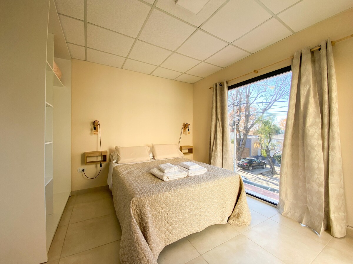 Enjoy a stylish experience at this upscale property right in the heart of San Rafael. For 2 people, with the option for 3 people (2-seater sofa bed in the living room). Close to everything (rotisserie/pharmacy/YPF/supermarket/restaurant) 1 block from the main avenue and 4 from km 0, with private covered garage. All the amenities for a pleasant stay. Wifi/ 2 Smart TV with HD cable/ Air Conditioning./Washing machine/ Microwave/ Refrigerator. Balcony (smoking is permitted in this area). Spacious bathroom.