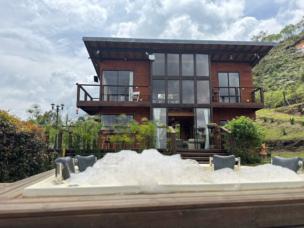 We assure you that you will be delighted with this place! Refugio Monte Alpino Nativo, Cabaña Alpina with private Jacuzzi, one hour from Medellín and 20 minutes from the Airport. with an exclusive design that will allow you to live a unique, warm, elegant, welcoming and private experience. Unplug from the routine and connect with nature. Immerse yourself in a warm bath in the Jacuzzi, enjoy a good wine in the fireplace or in the outdoor campfire, enjoy the scenery!