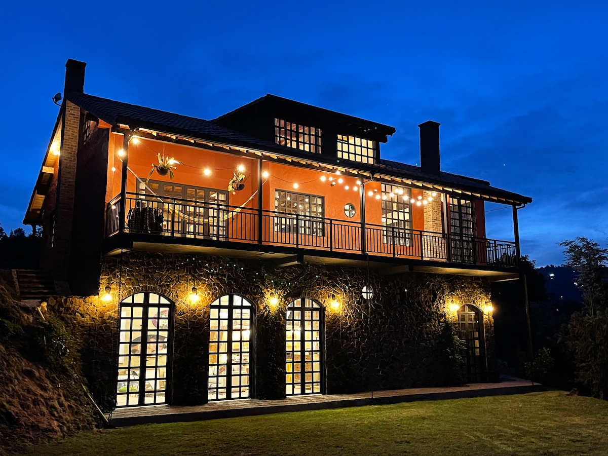 This spectacular house sits atop its own hill in an Avocado farm. It has 360 deg views inc Penol lake and has been recently built to be genuinely luxurious. The house has a spectacular double height living space, gorgeous modern kitchen and 4 bathrooms, and a huge master bedroom with en suite and balcony. Also a beautiful terrace inc huge hot tub, a pergola, a built in BBQ, a v.large open fire, fast WIFI, Netflix, hammocks and proper showers. The house and setting are genuinely breathtaking!