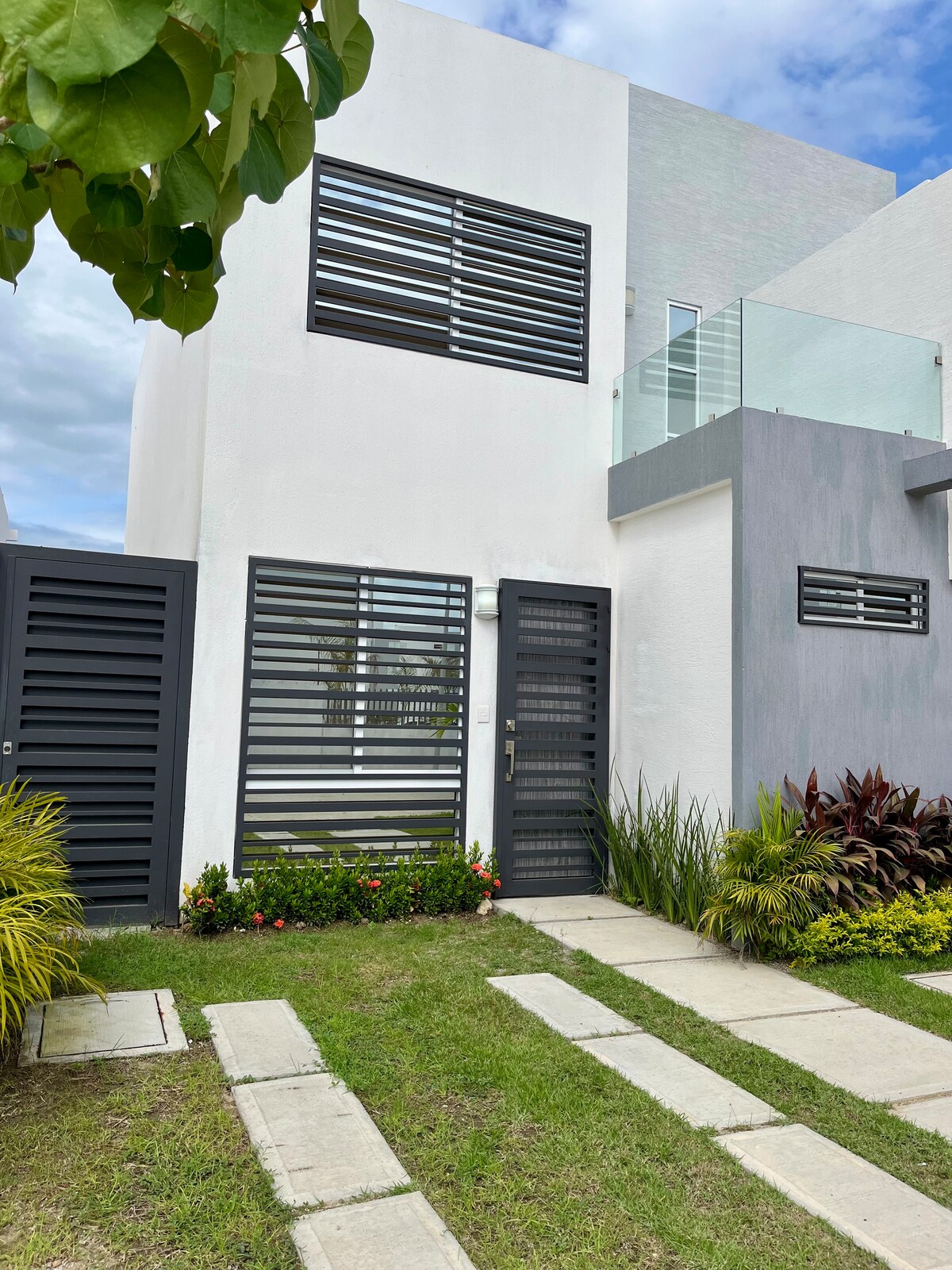 A modern two-story building is visible, featuring a light grey exterior with contrasting dark accents. The entrance is framed by a geometric balcony above. A well-maintained grassy area with a small plant is situated in front, along with a concrete pathway leading to the door.