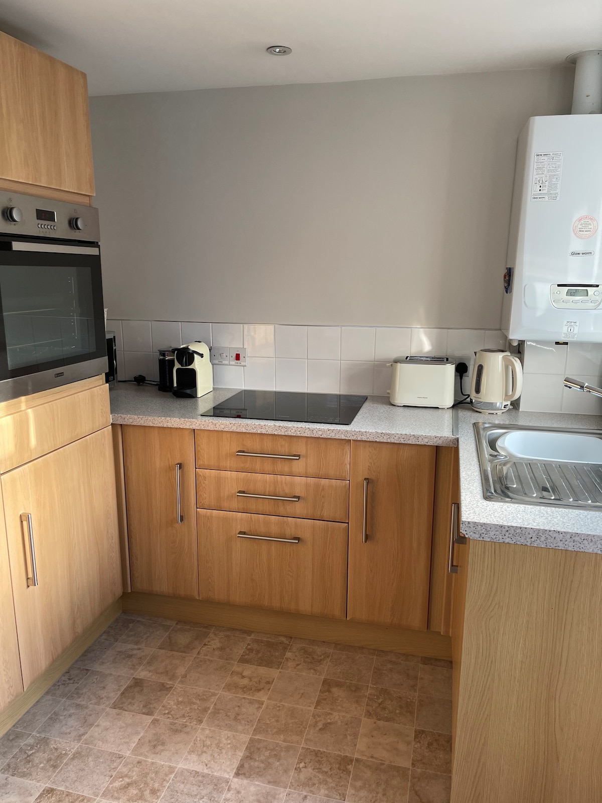 A newly fitted one bedroom apartment, with living area, full kitchen, large bedroom with king size bed, a full size single bed in the eaves, and an extra single bed if needed. We’ve kitted the Brickmaker’s Loft out with everything you would need. The kitchen has an oven, fridge, dishwasher, kettle, toaster, microwave and all the normal cooking bits, crockery etc. The bathroom has a walk-in shower, loo, and sink, and a washing machine if you need it. The bedroom is a lovely relaxing space.
