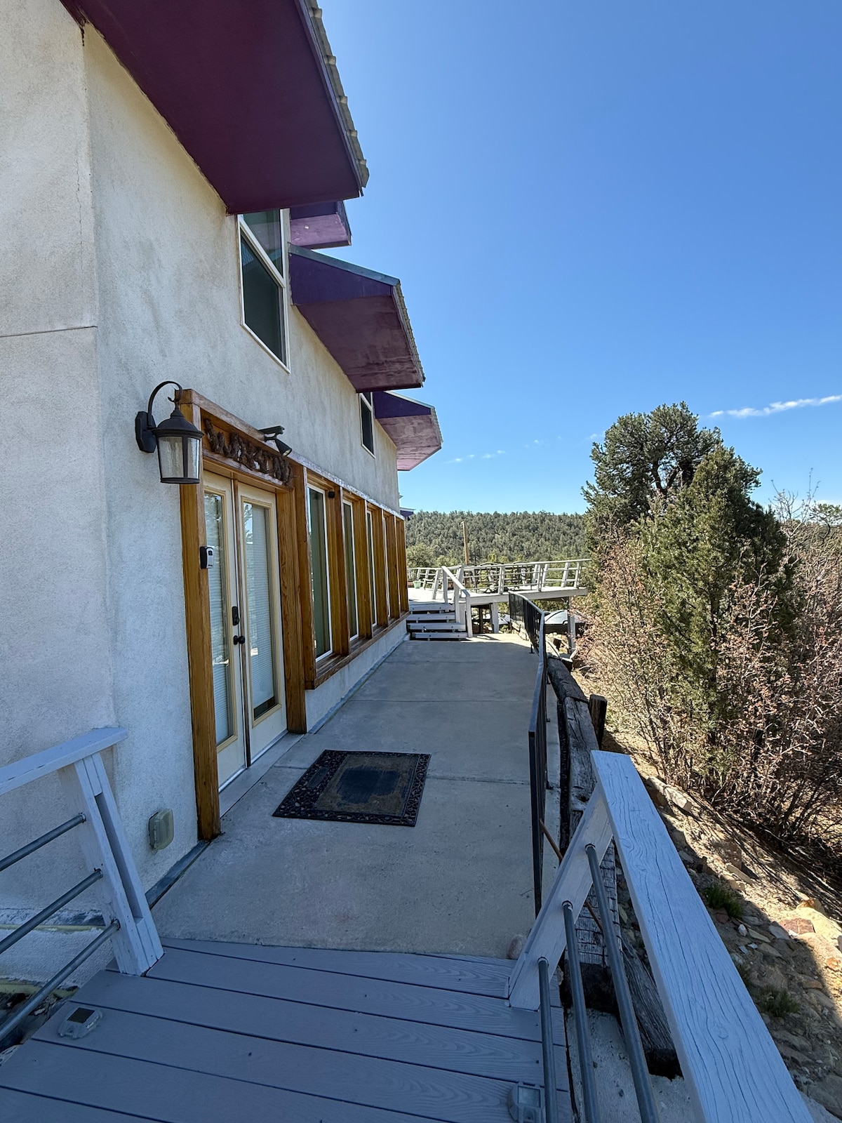 Mountain home conveniently located off 1-40 and 15 minutes from Albuquerque. This lovely 900 sq ft mountain view suite has a private entry from the main home. Enjoy a queen size bed with a sitting area overlooking the forest and workstation. A queen size sofa sleeper awaits you along with a large screen TV in the family room. Enjoy the sounds of nature on your patio next to the Cibola National Forest. Deluxe bath with jet tub, mini kitchen/bar, piano, board games, and library are for your use.