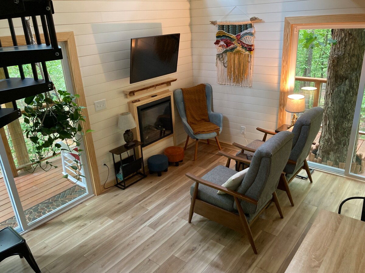 The Magnolia is a multi-story treehouse, nestled on a charming wooded lot, minutes to downtown Hillsborough, NC. Built in the treetops, this bright and airy space is full of handmade touches and warm wood tones. Enjoy your tea or coffee on the second story deck for two, relax in the cozy loft bedroom with views of the forest, prepare meals in the kitchen for a night in, and wrap up your day beside the outdoor fire pit and water garden. We can't wait to have you at The Magnolia!