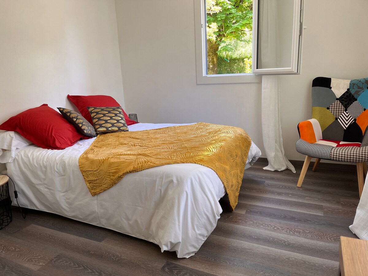 Meublé de tourisme 3 ☆ (classification 01/2024), 1st floor (stairs); entrance via garage. Bed made up, towels and kitchen linen provided. WIFI ACCESS. Access to garden: table, hammock, swing, barbecue. Parking space. Protected 2-wheel garage. Quiet village 10 minutes from Aurillac and 30 minutes from Le Lioran. Not suitable for people with reduced mobility.