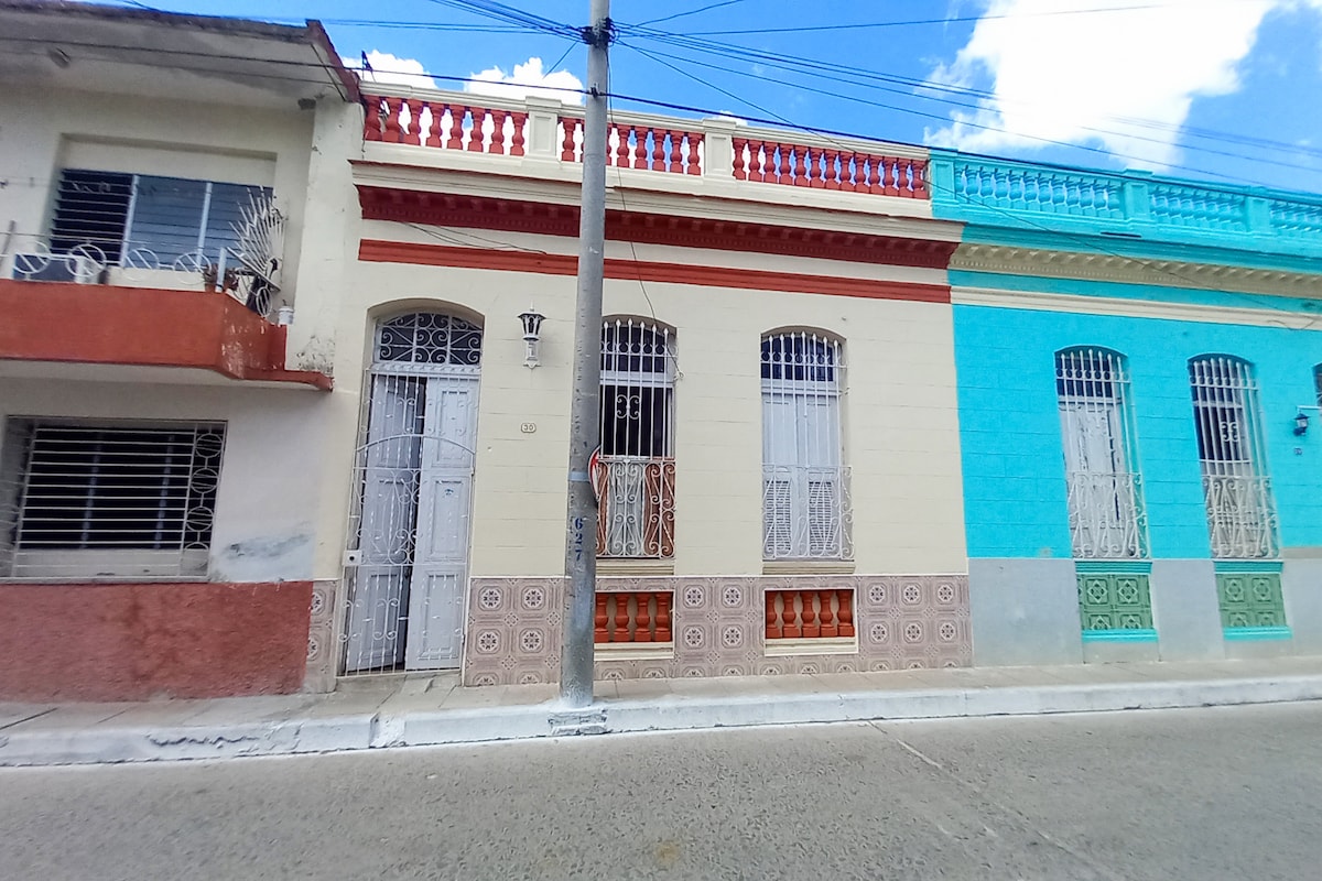 Authentic and Colonial house, cozy, quiet and comfortable, from the beginning of the last century, its architectural beauty marks the era very well, two imitation marble columns, with beautiful capitals, divides the room from the saleta, has two rooms enabled for rent and inner courtyard with waterfall, which falls through one of its cobbled walls. Nearby restaurants, cafes, shops, theater, museums, El Mejunje cultural center, Vidal Park