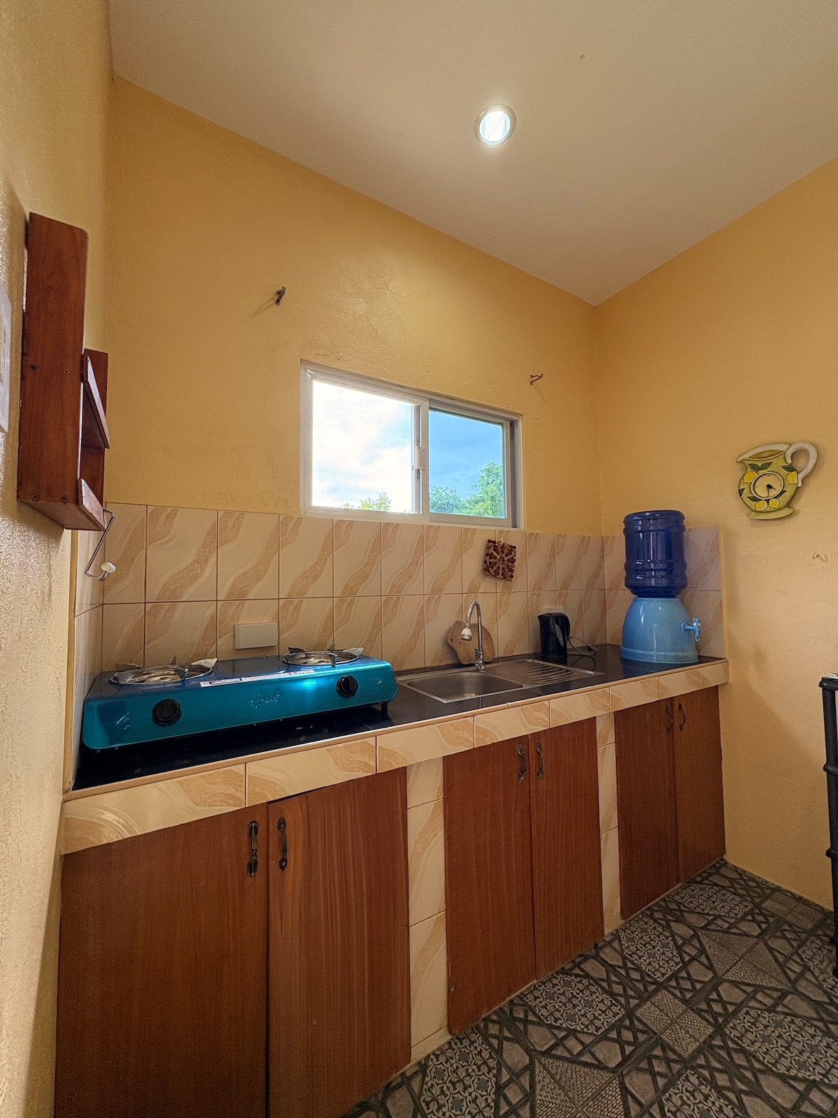 The small house has one bedroom/living room with a private bathroom, kitchen and patio. The bedroom has two beds (one double), a cabinet with a mirror, split-level quiet aircon, a ceiling fan, a TV, and a separate private entrance. The guests can use the large garden, the two native rest houses - one on top of the cliff coast - and the stairs to the sea. The room rate is for two guests. A third guest can be accommodated for an additional charge of P 800