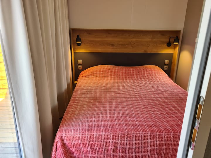Comfortable and air-conditioned mobile home, with an area of 30 m2, with a covered wooden terrace of 30 m2 on a wooded plot of 2000 m2. 1 living room with kitchenette, 1 bedroom with 1 bed of 140 cm. A 2nd bedroom with 2 bunk beds only for children. Satellite TV. Garden furniture and BBQ.