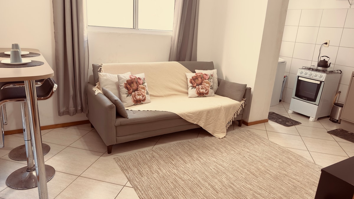 Enjoy a stylish experience in this well-located place. Beautiful furnished and equipped apartment, Wi-Fi, cable TV in the living room, air conditioning in the bedroom and living room. New property, building with elevator and security system. Apt with electronic lock. It is three blocks from the Santa Maria boardwalk, and there is a pharmacy, banks, market, square, bus stop, bakery, and restaurants nearby. Ideal property for the stay of those who want practicality and comfort.