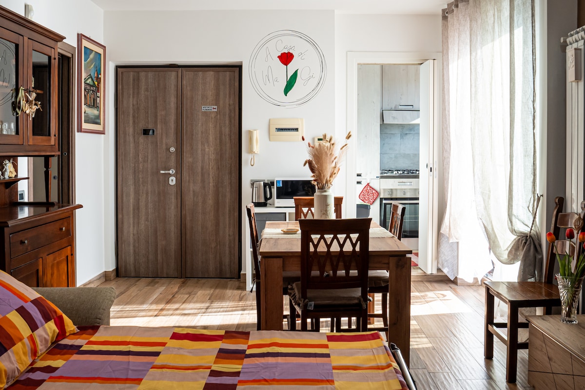 Cozy ground-floor studio apartment with a loft and a double bed with a smart TV, a living room with a sofa bed and a smart TV (both devices are connected to SKY base and NETFLIX), a fully equipped kitchen with everything you need to cook independently, a modern bathroom with a spacious shower equipped with a practical hygiene and linen courtesy kit. Independent entrance with a digital code for maximum freedom and security. Private parking space, air conditioning, and Wi-Fi.