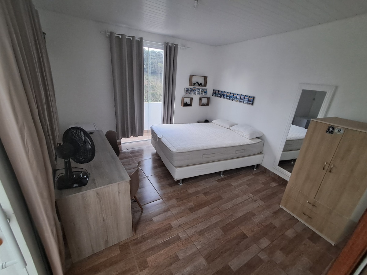Cabana located on a site just 5 minutes from the city center, close to several options that provide meals. Located 20 minutes from the main waterfalls and the Desengano State Park. The cabin has an equipped kitchen, queen bed in both bedrooms, sofa bed, fireplace, TV and Wi-Fi. Private yard with network, fire pit and portable barbecue.
