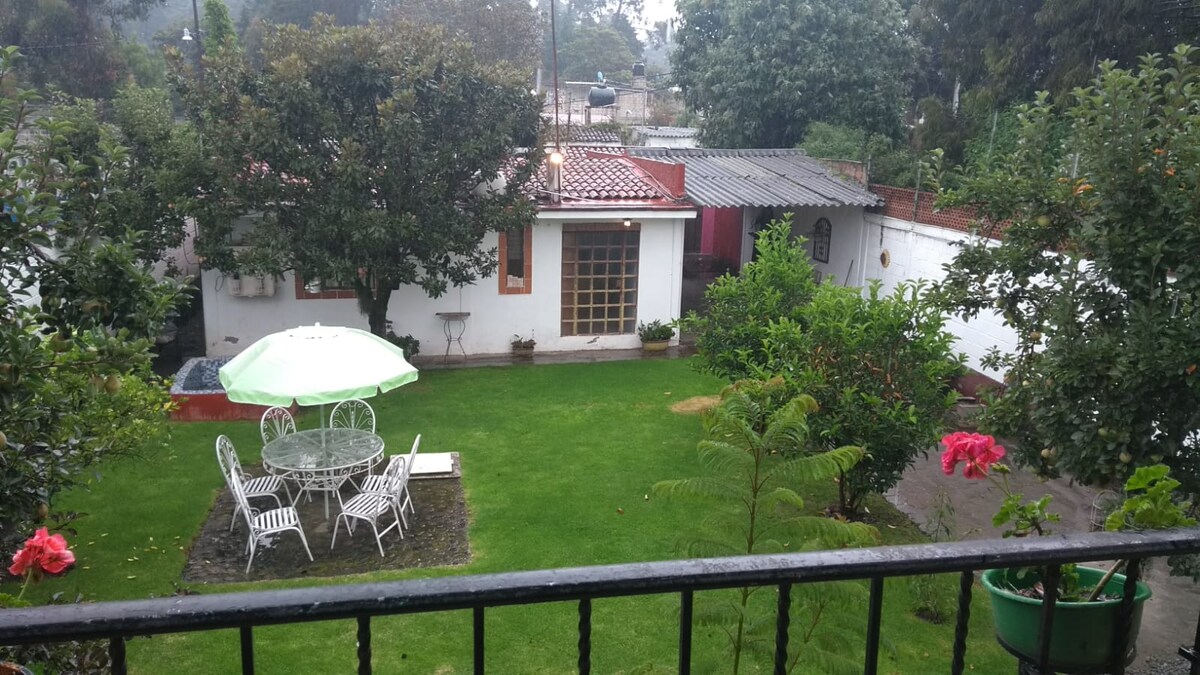 One hour from Mexico City. Enjoy direct contact with nature and release your stress in a cozy and spacious fully equipped house, with the forest just a step away, and with the volcanoes as accomplices. It has 1 bedroom, 1 suite, and a large room, film library, Kiosk with a wood-burning oven, and a grill for roasts. Walks: Camino al Salto, where the old Castañeda and the Burbuja waterfall are located. It has everything you need to make a home office (desk, fiber optic internet).