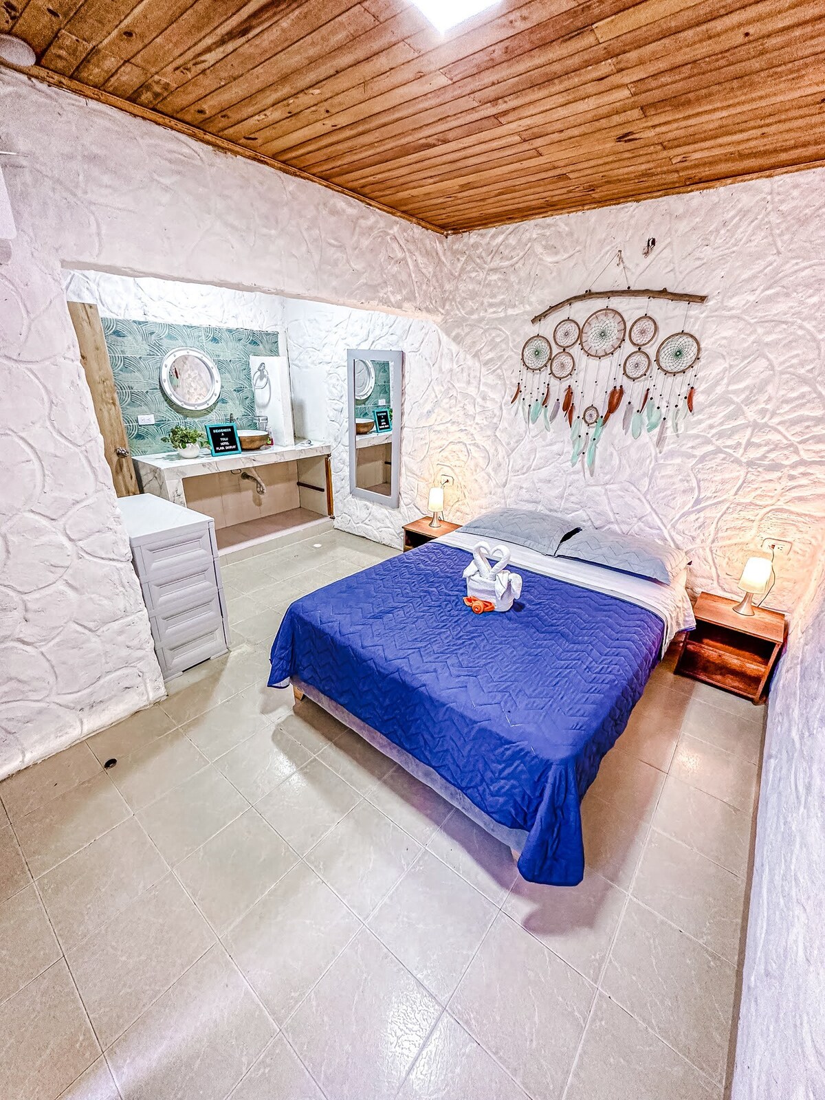 Double room for couples with a double bed, private bathroom, air conditioning, and a 32" LED TV. The base price includes: Breakfast for 2 people, Wi-Fi, sheets and towels, toilet soap, books and games. We prepare delicious and lovingly prepared local cuisine. Our social areas are clean, quiet, warm, equipped with furniture and hammocks."