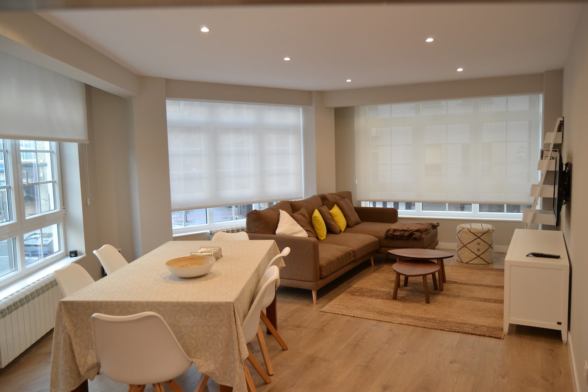 Beautiful 105m2 apartment designed to make your stay in Compostela unique. "Alén do Camiño" is located in one of the quietest, safest, and most central areas of the city: next to the Intermodal Station, train-bus-taxi (Madrid 3 hours away). Near the Galician Parliament, you can enjoy the historic center and the Cathedral in a 10-minute walk. It offers free parking, and within its 50m2 area you will find a pharmacy, hospitals, a playground, and various restaurants.