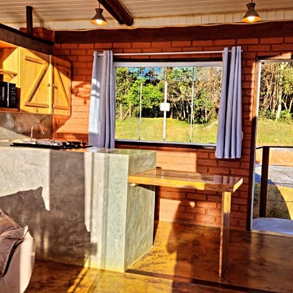 The chalet accommodates up to 4 people, has a bedroom with TV, a living room with a sofa bed with a fireplace and TV, a full kitchen, a fondue pot, an emergency lamp, automatic lights in the outdoor area with motion sensors, SKY channels and internet TV, a portable barbecue, a large leisure area, a balcony with a hammock and a beautiful forest, a place with a lot of tranquility and contact with nature, perfect for enjoying moments with the family The sunset facing the balcony is awesome!