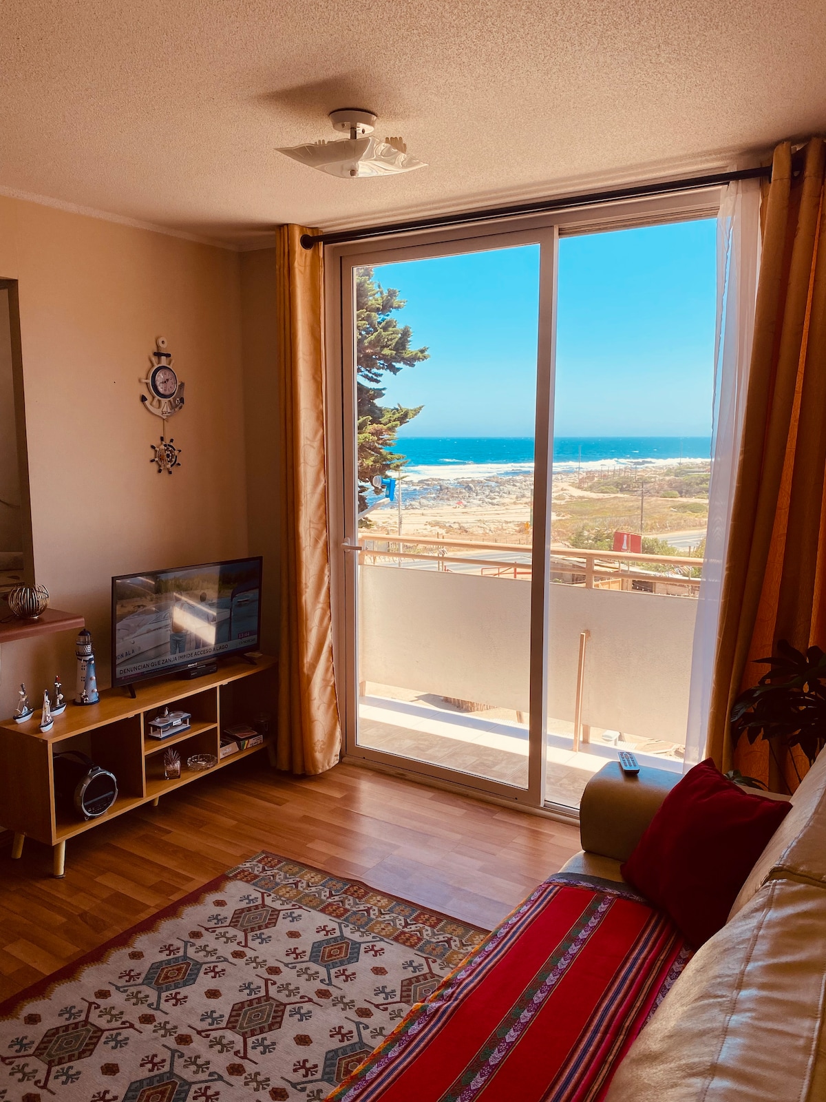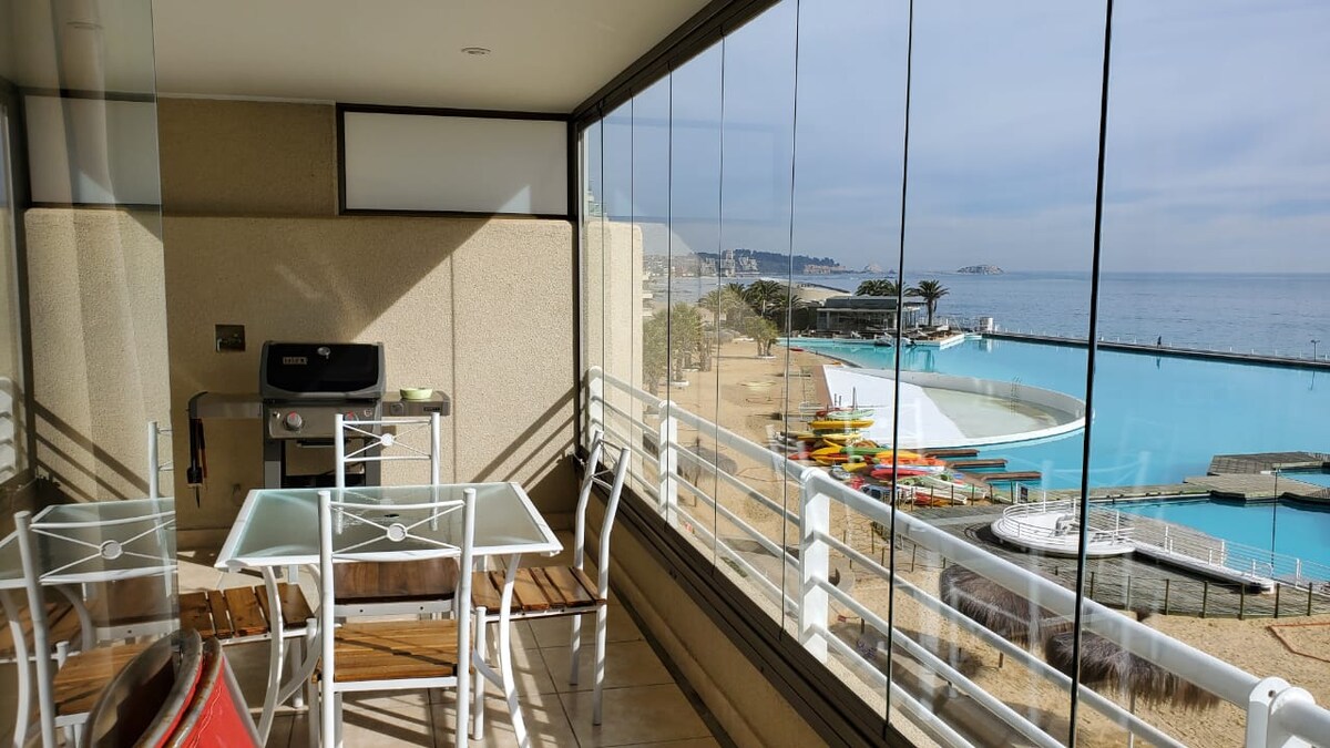 Comfortable apartment with exit to the coastal sector, very comfortable and with direct views of the sea, sunset. Everything you're looking for to rest in the V region. An exquisite terrace with panoramic closure and a large grill that allows you to enjoy it all year round. Well-equipped apartment, it has a 50” smart TV with Netflix, Disney+, Prime video, HBO Max, YouTube, among others. It has many board games such as the fabulous great Santiago and many more, it also has a beach set.