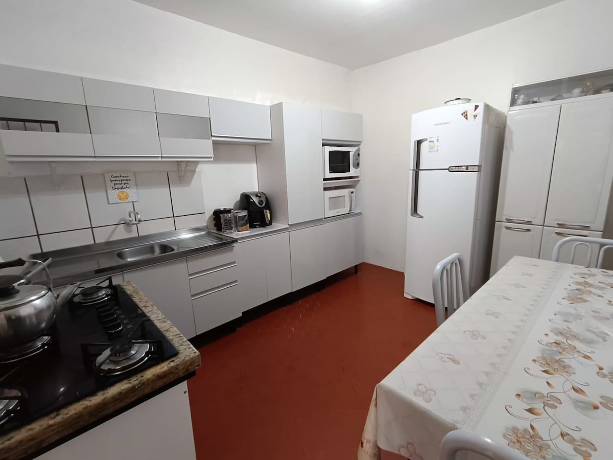 Alugo casa inteira com 1 quarto com ar condicionado com 1 cama king, 1 cama de solteiro e 1 colchão extra de solteiro com roupas de cama. Disponibilizo somente 1 quarto pois o outro não tem ar condicionado e fica fechado com alguns móveis desnecessários para uso durante a estadia. Possui televisão com Netflix, ventilador portátil, wifi, cozinha com fogão e forno elétrico, panelas e pratos. Diária para 2 pessoas com valor adicional por pessoa e valor adicional de animal de estimação 50,00.