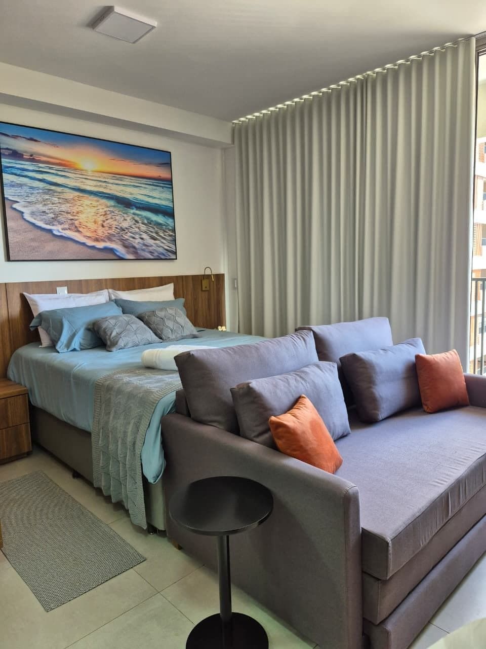 Apartment on the 6th floor of DuoJK, with a cozy design and well-planned environments. It has a comfortable bedroom with a double bed and complete trousseau, a living room with a sofa bed and smart TV, an equipped kitchen (induction stove, microwave, refrigerator, Dolce Gusto coffee maker), a modern bathroom and a large balcony. A practical and pleasant space to enjoy the city in comfort and style. Come and feel at home!