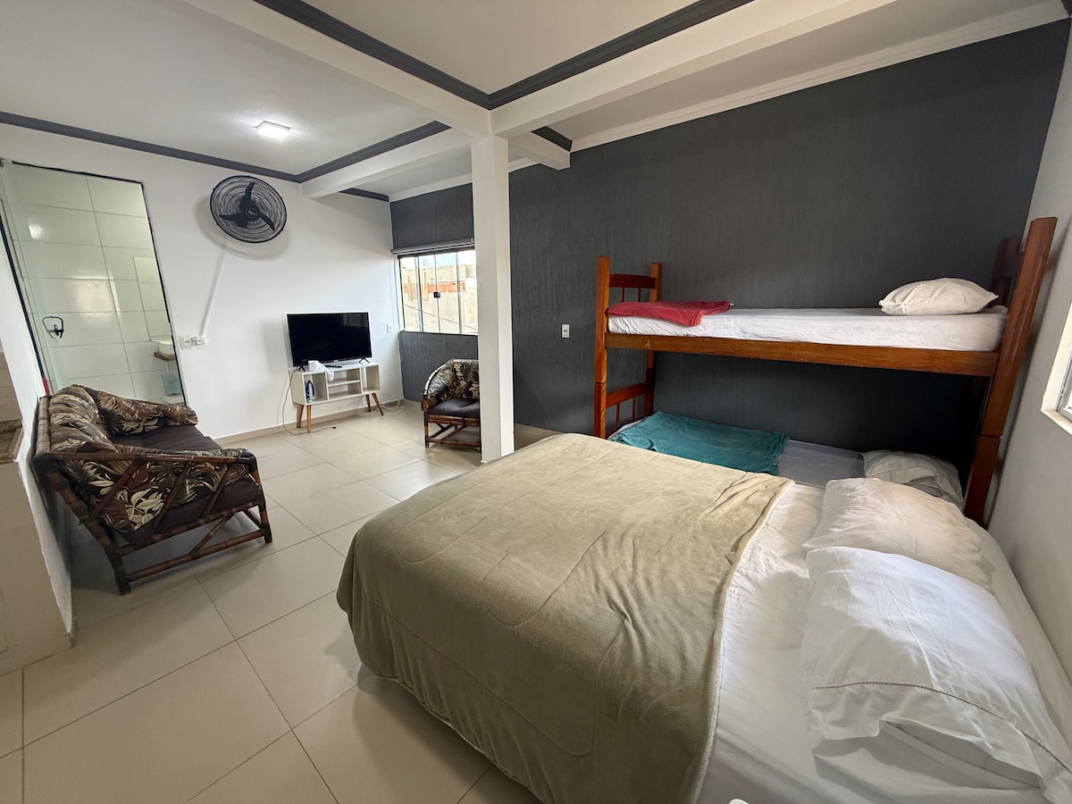 Aconchegante suíte no 3º andar, ideal para quem busca conforto e praticidade. O espaço é compacto, mas bem planejado, oferecendo o essencial para uma estadia tranquila. O destaque é a varanda com vista incrível para o pôr do sol, perfeita para relaxar, além da churrasqueira que torna o ambiente ainda mais especial. Acomoda até 4 pessoas, com uma cama de casal e um beliche, banheiro privativo e cozinha equipada. Cozinha completa , churrasqueira ,Tv. Vista pro por do sol ☀️