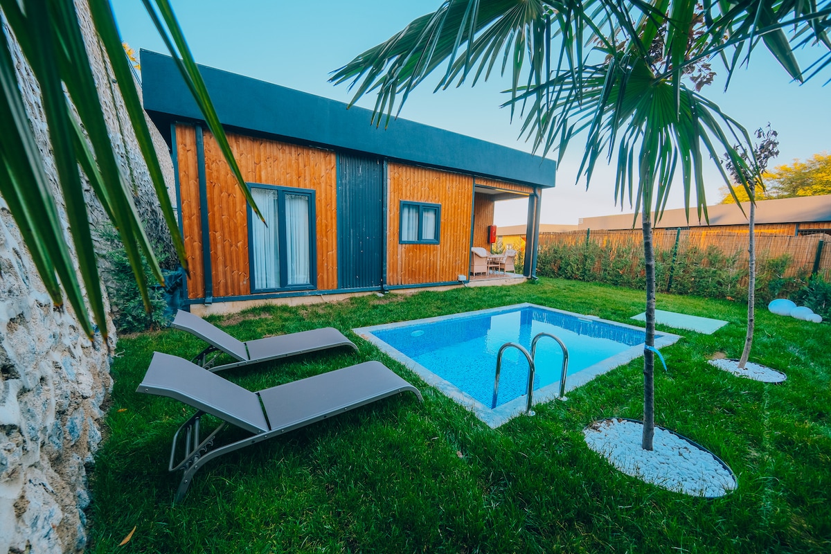 * 1+1 Villa, Lake or Garden View, Heated Private Pool houses are 60 m2 and consist of 1 living room and 1 bedroom. The sofa in the living room is used as an extra bed for the 3rd person. * Our houses have their own private heated pool, garden, garden furniture, jacuzzi, seating area, television, dining table, kettle, tea and coffee, toilet, bathroom, hair dryer, underfloor heating, air conditioning, fiber internet.