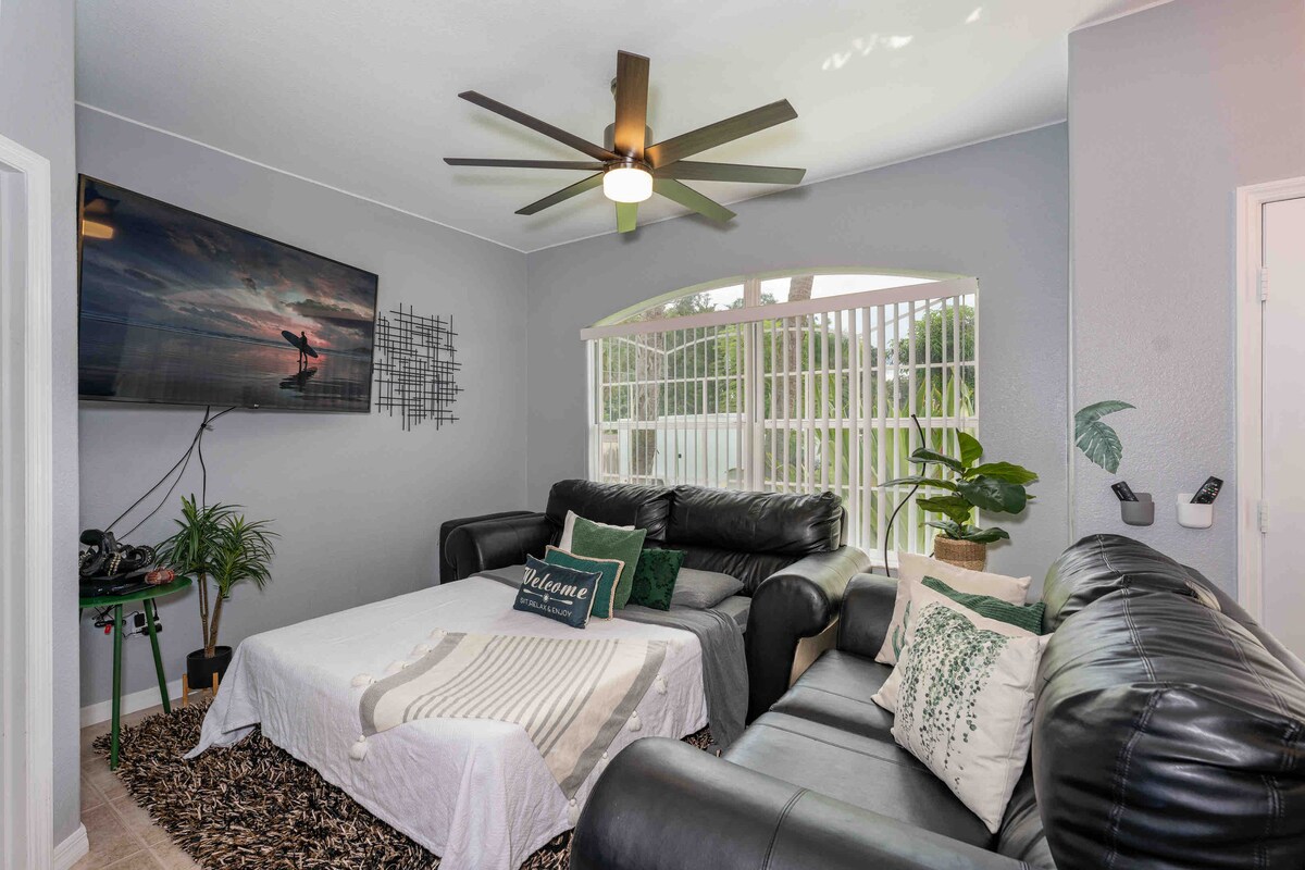 Welcome to Golf Cove Paradise ☀️ A peaceful resort style outdoor space + private + oversized solar heated pool creates a perfect vacation oasis. Covered lanai = shade. BBQ & watch your favorite sports on 55” outdoor tv. Walk the golf cart paths, swim laps, get a tan, read a book, play music & games, sip on tropical drinks & float all your cares away. Pretty sunsets overlooking a golf course setting. A.M. coffee outside to hear the birds sing. Carefree outdoor living is what it’s all about here.