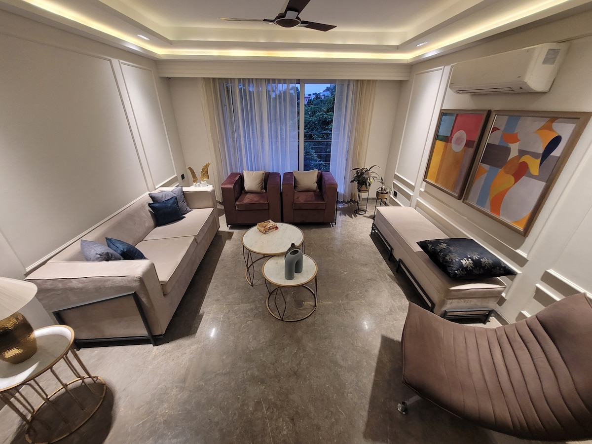 A ground floor home on a tree-lined street in DLF Phase 2 — recently renovated, spotlessly maintained, and just minutes from Cyber City, Golf Course Road, Delhi Metro & IGI Airport. Shorter commutes, lighter cab fares. The generous 2BR layout with a spacious living room — all air-conditioned, a pantry kitchen, and an uncommon luxury in DelhiNCR — a private backyard. If you appreciate naturally lit spaces, minimalist design, and a genuine focus on cleanliness — you will feel right at home here.