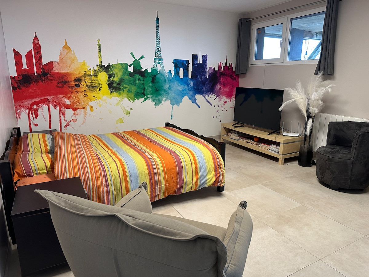 In a private residence, very quiet and carefully maintained, 30 square meter modern studio on the 3rd and top floor, convenient, warm, close to a large shopping area, can accommodate two guests. Located 10 minutes from Germany, all comforts, 1 double bed, Wi-Fi, TV, private parking, bathroom with bathtub/shower, hairdryer, magnifying mirror and washing machine, kitchen equipped with a microwave, oven, "Senséo" coffee maker, toaster, kettle... 1 extra bed available.