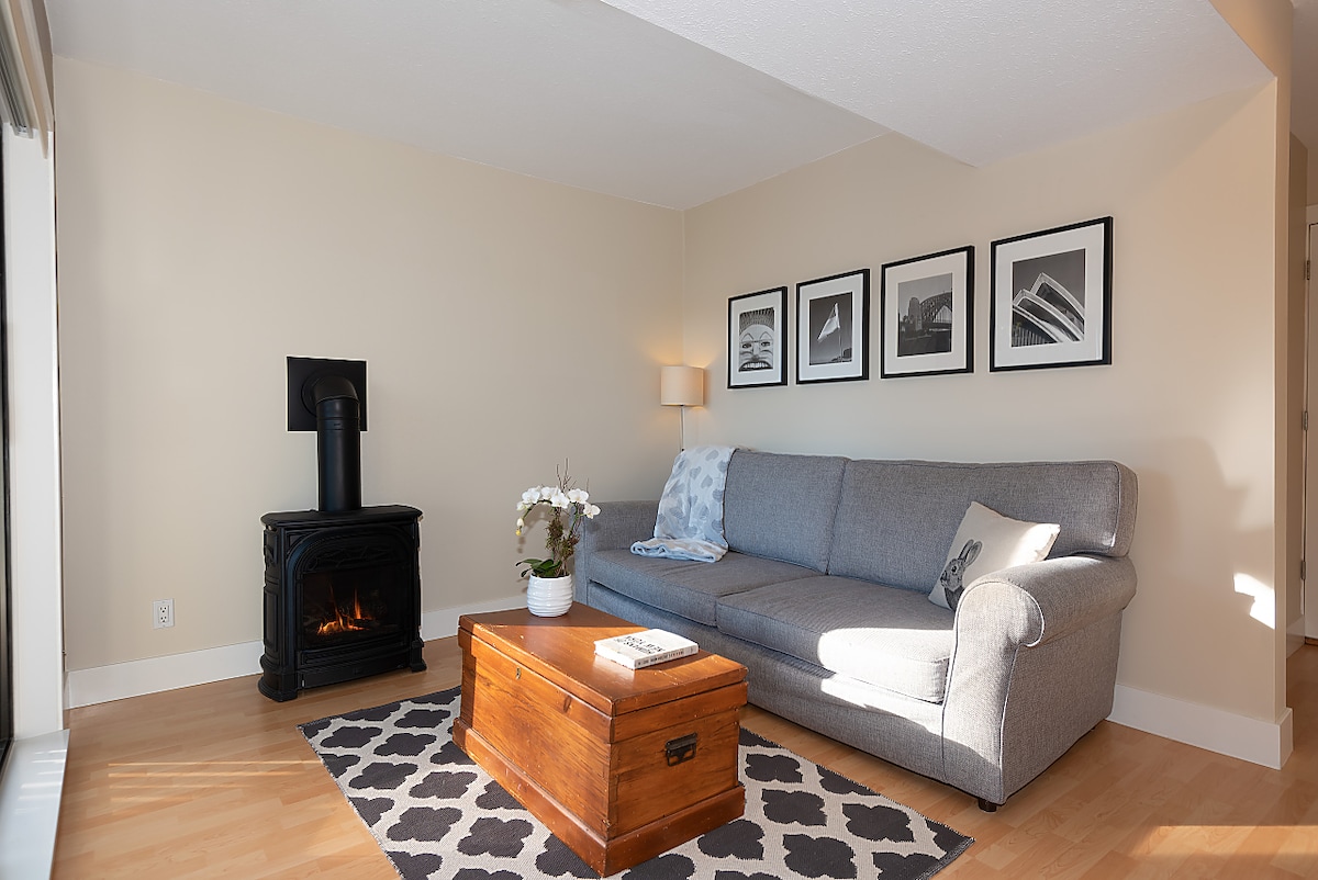 Oceanfront with stunning views of Howe Sound/Coastal Mountains (above photo). Close to town, ferry, restaurants. A 10 minute walk through our forest leads to our swimmable beach. Suite is newly renovated with stone fireplace insert, queen bed, new sofa bed, keyless entrance and private deck (bedding and towels provided). Kitchenette has microwave, small fridge, infra-red single burner, water dispenser, coffee/espresso makers, dishes, no sink (we do the dishes for you). BL#00000625