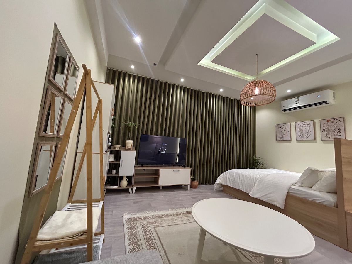A studio with self check-in, 6 minutes from the Kingdom Tower, close to all services, and characterized by a warm and elegant atmosphere, a room with a master bed, ideal for individuals or couples looking for a comfortable and suitable living space. It contains: Internet Iron, clothes and electric stove Cooking utensils Hearth Note: There is no private parking