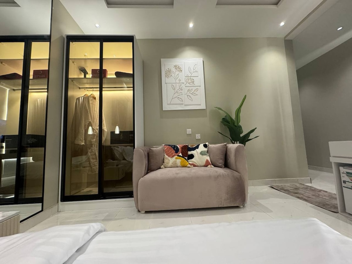 Luxury Studio Near Boulevard Features: 1- Close to all Riyadh Seasons events 2- Near the first Aqeeq Park 3- Aqeeq Park🌴 4- Riyadh Park There is a laundry, supermarket, Etisalat shop, and men's barber shop on the main street of the building We wish you a happy stay in your second home 💜