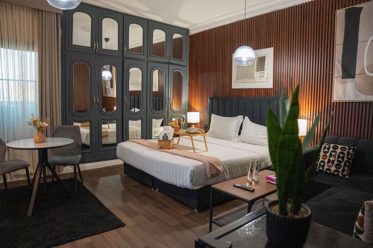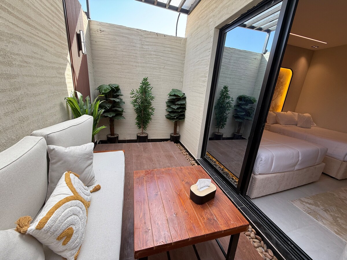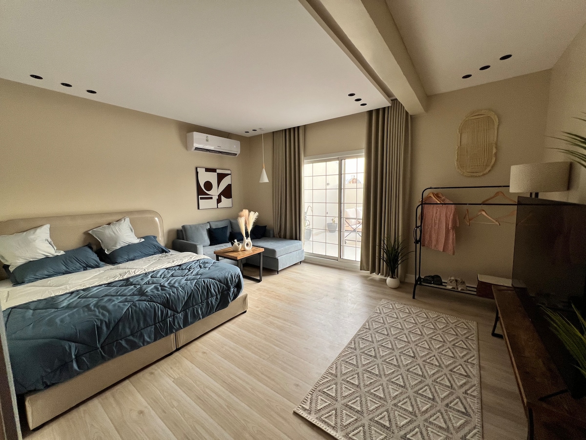 An elegant studio with complete privacy and smart self-entry with a unique design and a combination of comfortable colors and wonderful hotel services, it also features an outdoor seating with a beautiful view and a private barbecue corner that allows you to enjoy the outdoor courtyard, in addition to the presence of a small side kitchen that contains a refrigerator, kettle, microwave and surface oven, located in Al-Aqeeq neighborhood in a strategic location very close to Riyadh Boulevard, airport, restaurants and many nearby and distinctive event venues