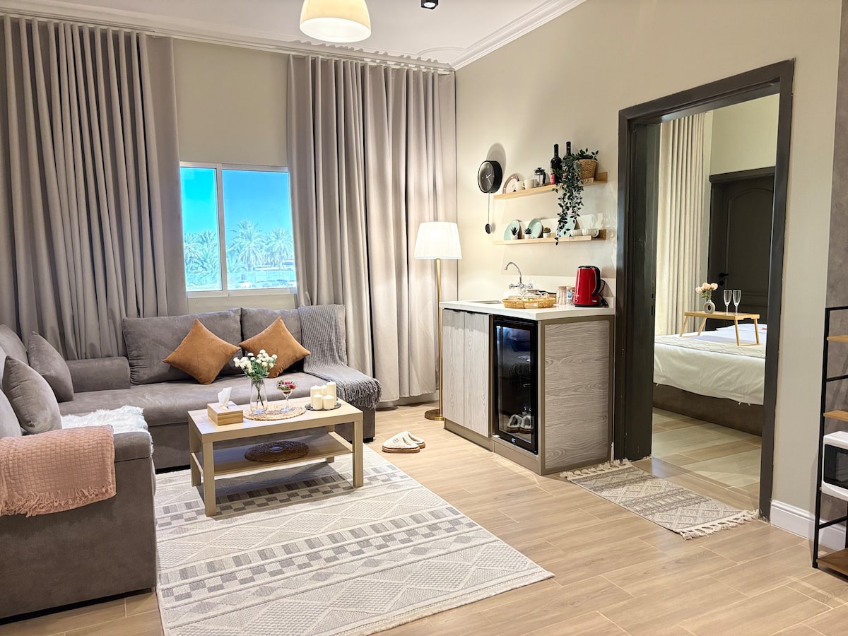 Relax in this modern and quiet accommodation, where elegant design meets complete comfort. The apartment is in a prime location, just a 5-minute drive from the Prophet's Mosque and 3 minutes from Quba Mosque. 🛋️ The apartment features modern decor and quiet touches that enhance the stay experience, with a space dedicated to relaxation