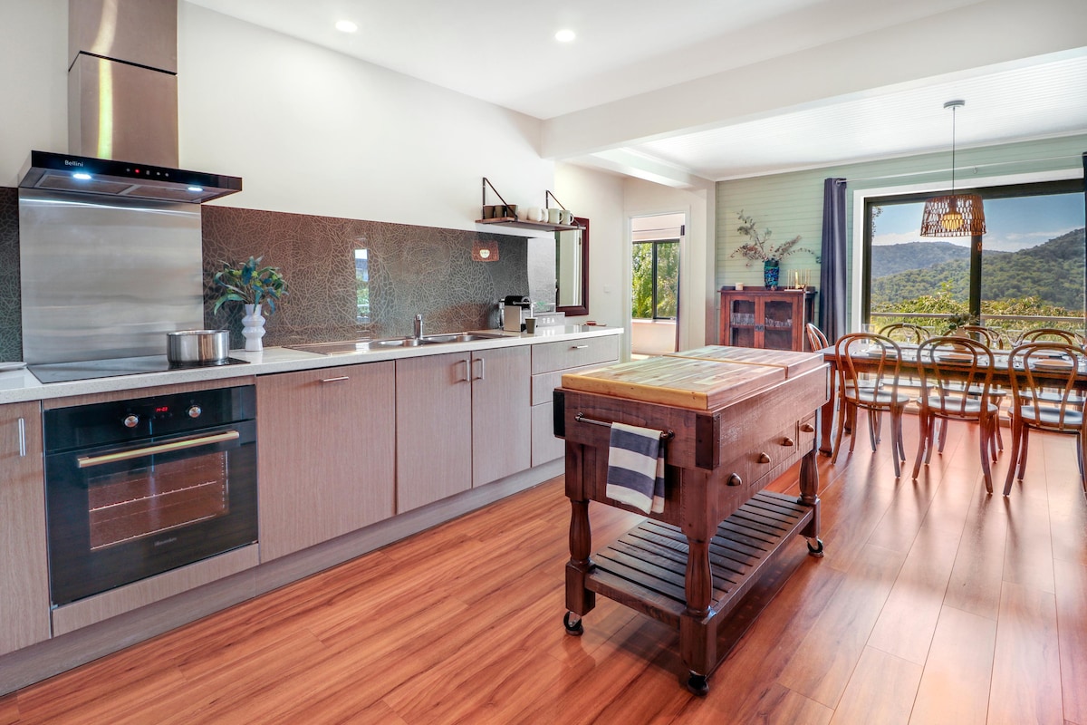 Wild Fauna is a large open plan modern house in beautiful surrounds. The spacious living, dining and kitchen area has all the room to spend your holiday with all the family. The expansive deck is the perfect place to spend summer evenings with the local wildlife, overlooking magnificent views and winter nights are cosy in front of the fire. The kitchen is well equipped and has a large social island.