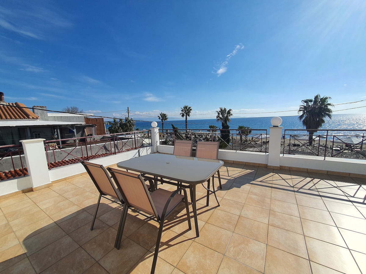 A 2 bedroom seafront holiday home ideal for 4 to 5 people, with direct access to a private beach, located in a wonderfully serene surrounding overlooking the sea, 1h 15min drive away from Athens International Airport. The house enjoys a panoramic view to the sea, is renovated and is professionally designed and decorated. NOTE: In case your desired dates are not available, check my other listings of two brand new properties adjacent to this one!