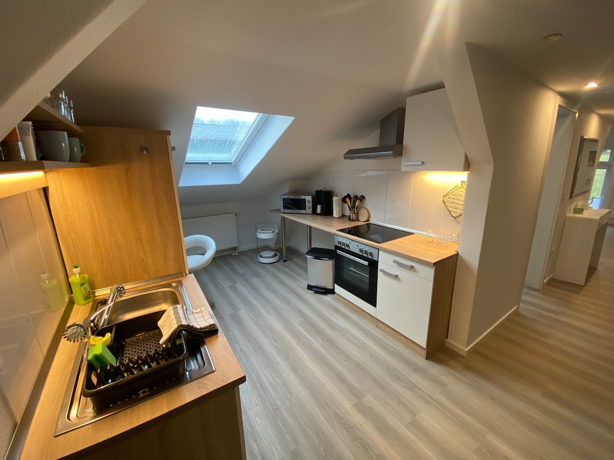 Cozy, beautiful, bright attic apartment, 2 single beds 1.00 x 2.00 m or pushed together as a double bed (200 x 200), as well as a single bed (100 x 200) in the separate adjoining room (also dressing room). If more guests are added, it is possible to fold out a folding mattress for the floor; small fully equipped pantry kitchen, great bathtub and shower, TV, telephone and Wi-Fi Private parking is available right outside the front door.
