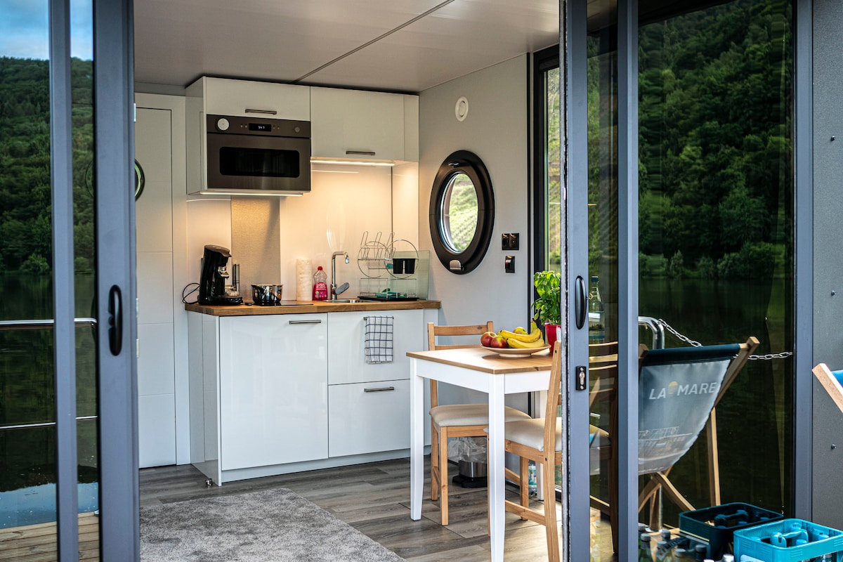 From December to the end of February, the houseboat is located in the harbor basin, as shown in the first two pictures. Unique accommodation on the Moselle. The houseboat is located on the outer quay, with a direct view of the water. Spoiled by the sun all day. It has a double bedroom, bathroom with shower, kitchen-living room and terrace. On the roof there is another sun terrace.