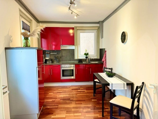 Stylish 2-room apartment located in the district of Schwäbisch Hall (about 2 km to the center). The bakery, Lidl and bus can be reached in a 3-minute walk. Separate bathroom and bedroom. Bright living/dining area with new kitchen (fully equipped with electrical appliances). In addition, a sofa bed is available in the living room. The terrace invites you to linger and allows a view into the beautiful garden. All rooms with underfloor heating, parking space on the property available.