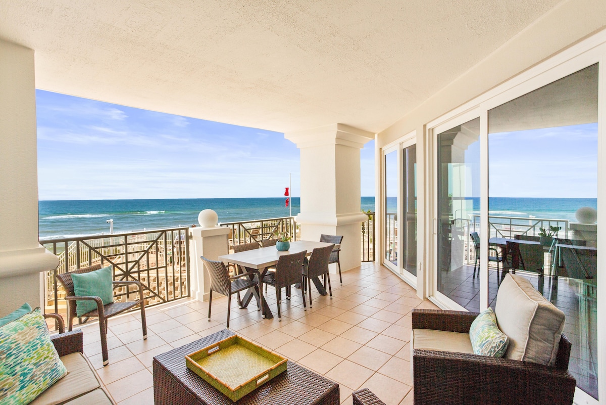 Beachfront Corner Condo in Destin - Panoramic Gulf Views Summer dates just released! Experience luxury in our Destin beachfront condo! This 3-bedroom, 2-bath unit offers panoramic Gulf views from the living area, kitchen, and master bedroom. Enjoy a renovated balcony, heated pool, tennis, basketball, pickleball, gym, and sauna. Beach chairs and umbrella included March-October. Convenient elevator and steps access. Book your Destin vacation rental now for an unforgettable beach getaway!