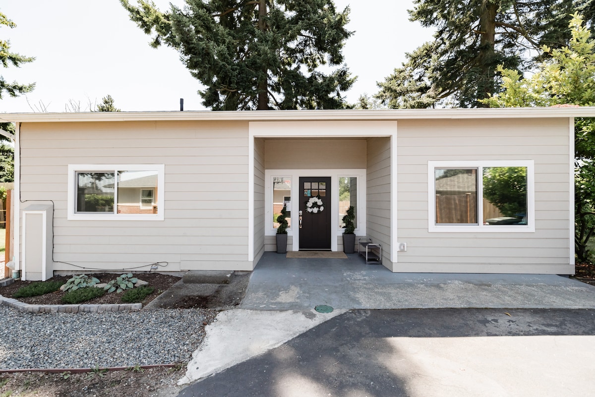 The open spaces and white fixtures of this home are elevated by soaring ten-foot ceilings, hardwood floors, chic photography, and cute potted plants. Head out to the private yard for a cookout and enjoy basking in the sun and fresh air, then kick back on the oversized sectional and enjoy the 4K smart TV (WIth Netflix). At the end of the day, rest and relax in peace and comfort. The hotel quality bedding, towels, and all surfaces have been meticulously cleaned to the highest standard prior to your arrival. ★The Guest House★ This home was built in 2017 and you'll feel like you're in a modern luxury condo with soaring ten foot ceilings, open floor plan, and fully stocked modern kitchen. You'll have total privacy and security, as the house is totally detached and situated at the opposed end of our property - It even has its own private yard! ★Two Bedrooms★ Both bedrooms are perfect for resting and recharging with hotel quality mattresses, bedding and linens, freshly cleaned before your arrival. You'll have plenty of room to unpack and make yourself at home with dressers and plenty of closet space! Both rooms have queen size beds! For groups needing more sleeping arrangements, you'll have an amazing sectional in the living room and access to a queen size Air Mattress and extra linens. ★The Kitchen★ If you like to enjoy home cooked meals while you're traveling you will LOVE staying here. The open concept kitchen has quartz counter tops, brand new appliances (including gas range), and is fully stocked with all the usual cooking equipment. Need something you don't see? Just ask and we'll bring it over if we have it! ★The Living Room★ You will have no problem relaxing and making yourself at home in the open concept living room. Kick back on the SUPER comfy over sized sectional and watch your favorite movie or show on the 60' 4K TV with cable, streaming Netflix, Amazon Prime, and of course high speed WiFi. When you've had enough screen time, you can dive into the stash of board games! ★Private Yard★ Just walk out the back of the unit and you'll be on your own private patio overlooking your own private yard! It's equipped with everything you need for a cookout! ★Bathroom and Laundry★ The modern bathroom is fully stocked with toiletries including shampoo, conditioner, body wash, and hair dryer! There is a washer and dryer with complimentary detergent for your convenience. The entire house is all yours! In addition, there is a private yard enclosed with fences for you to enjoy! The house shares a driveway with another unit, but there is a dedicated parking space and unlimited street parking because its a totally residential neighborhood! We are happy to help with anything you need, and we can stop by and help with any questions you have about the property! However, we're also happy to give you total privacy during your stay! The home is in a quiet and friendly residential neighborhood with a Safeway grocery store less than a mile away. Spend the day at the expansive retail district just down the hill, or hop on the Seatac light rail to easily reach downtown Seattle. For those needing access to the airport and Seatac convention centers, the home is conveniently situated less than a mile away! If you have access to a car, you'll love how easy it is go get around from this guest house! You can hop on I-5 or I-99 and get into Seattle or Tacoma in 15-20 minutes. If you don't want to deal with Seattle traffic or parking, you can park at the Tukwila light rail station and glide into Seattle in about 30 minutes! If you don't have a car, you'll also have plenty of options to get around! The Seatac lightrail station is just over a half mile away and is an easy walk. There is also a bus line (156) about a 3 block walk away that picks up every 15 minutes. Getting to and from the airport is incredibly easy (walkable, or a 5 minute taxi/ride share). Ride shares are constantly available within just a few minutes, and are a great way to get around! In addition to Seattle, there is a bustling shopping and dining district just down the hill called Southcenter. It has TONS of options for dining, movie theatres, shopping, IKEA, and one of the largest malls in the region. Southcenter is a 5-10 minute drive away! The house is situated in the back of our property and you access it by going around the main house on the west side (right of the main house). The dedicated parking spot is marked with a welcome sign and is on the right side of the driveway. There is a wide swinging gate that opens up directly to the front steps of your Airbnb!