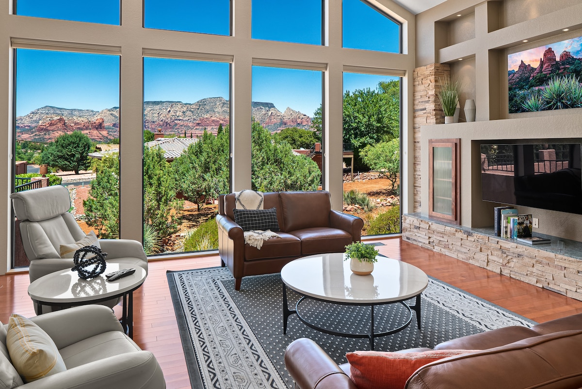 Enjoy majestic views of famous Sedona Red Rocks in the luxury of your own private villa. Steps away from iconic Chapel of the Holy Cross, popular hiking trails. House features mid-century modern aesthetic, 1- KING size , 1 -Sofa bed with 2 baths, 2 spacious living rooms, kitchen, office, outdoor dining space w BBQ. After a day in the desert, just short distance away, head to Downtown Sedona, pursue incredible art galleries and explore local restaurants ! TPT# 21426328/ 1,800 Sq. Ft.