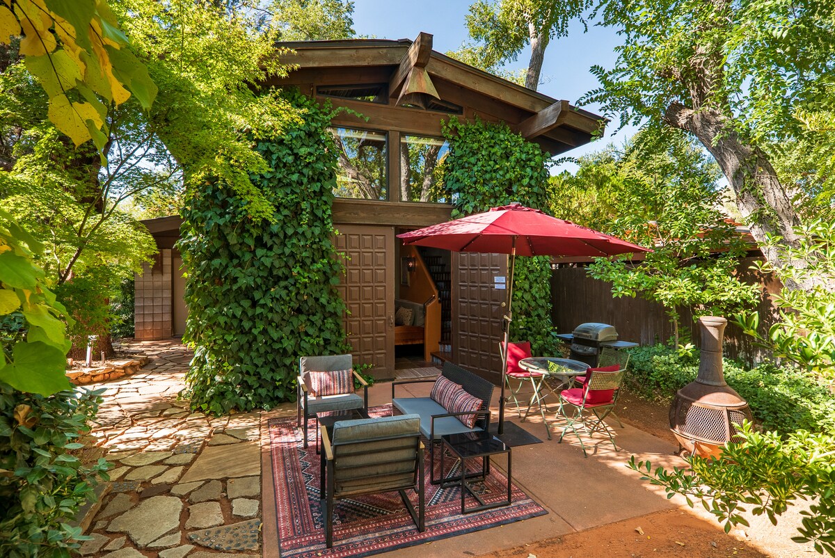 Come, relax and stargaze. Enjoy your yoga sessions among the huge trees. Flowers and green spaces invite you to linger on the terrace and enjoy the brilliant sunsets. In winter, crystal views and warm lap rugs make stargazing and early morning coffee a delight. Our cozy, tasteful cottage is in the heart of Sedona: very private but walking distance to Oak Creek and Tlaquepaque. From your private porch watch the incredible sunset colors or full moon rise over the eastern formations. Pure magic!
