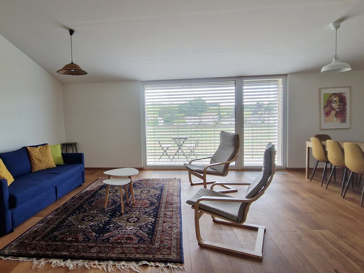 Have fun with the whole family or friends at this stylish and spacious place. The penthouse apartment has 4 bedrooms. The residence has a seasonal pool and a playground, It is very well located, in a calm, residential village, at a 2 minute walking distance from the forest, with good access by car and public transport (bus stop in front of the building). Murten is 10 minutes away, and Fribourg and Bern are about 20 minutes away.